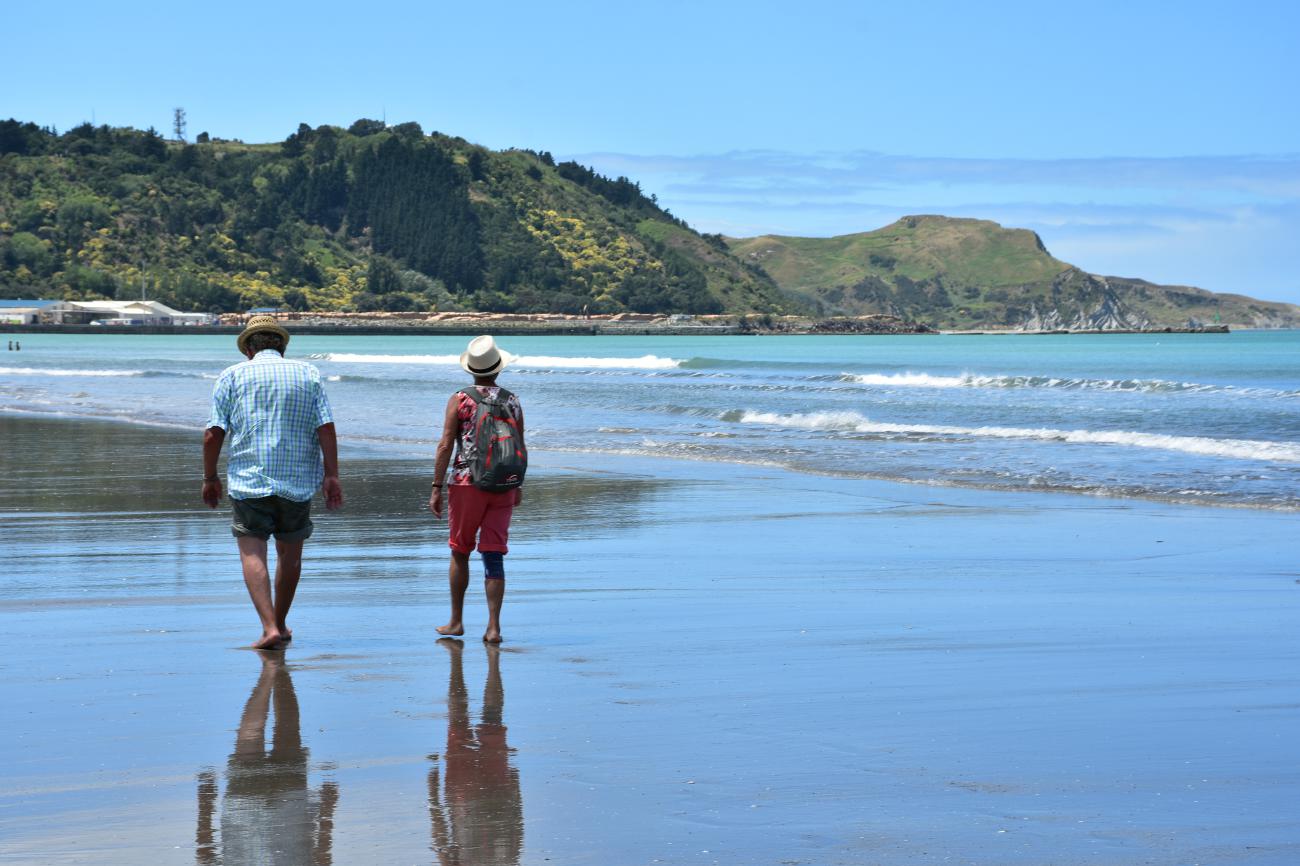 Dann geht es ans Meer. Wir fahren an den Anfang der Promenade und starten einen wunderschönen Spaziergang am Meer entlang bis zum Ender der Promenade. Dort stehen zwei Denkmäler. Eins von Franz Josef Cook und eins vom kleinen Nick. Dieser Ort sagt man, sei der erste der entdeckt worden sei und der kleine Nick hat das Land als Erster gesehen. Gegenüber haben wir noch den Frachthafen beobachtet und später noch einen Hund, der auf einem Surfbrett gestanden hat.