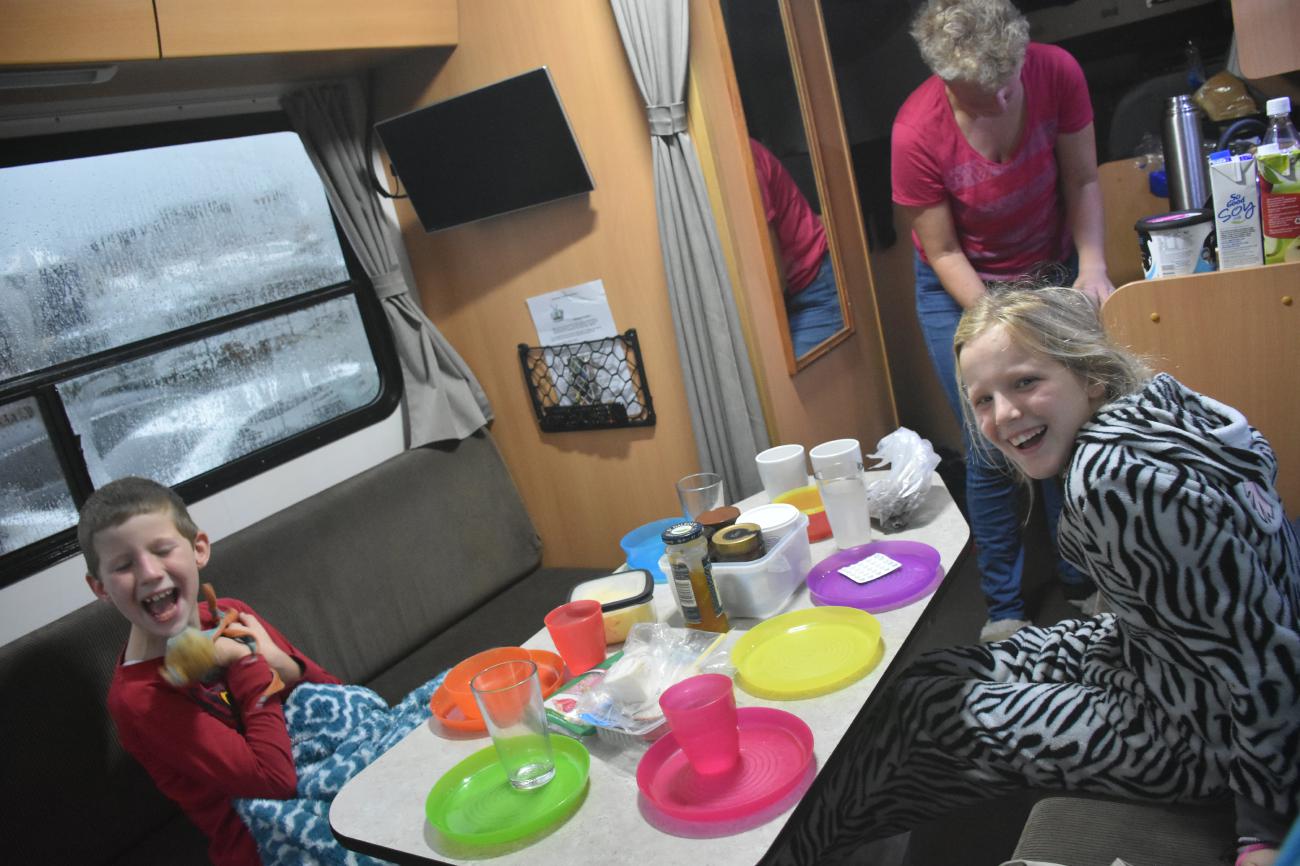 At 9 am all the others are awake too and we have a breakfast in the campervan. We have found a freedom campsite in Eltham right next to the library.