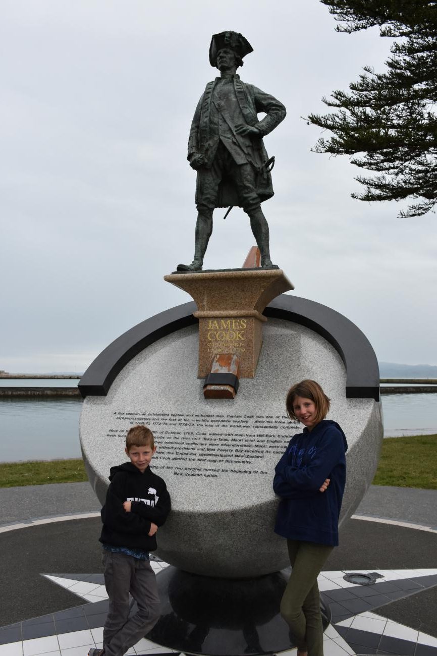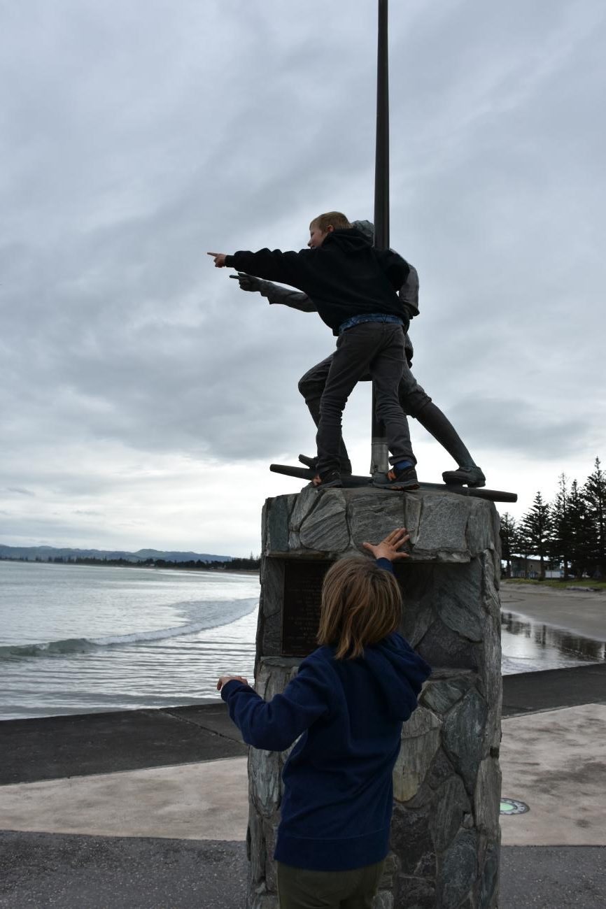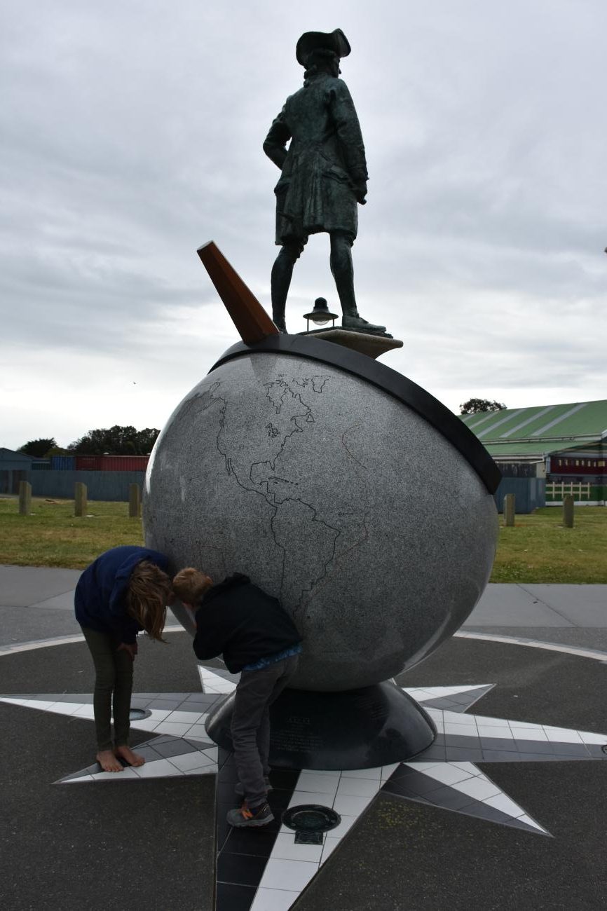 Zuerst haben wir die beiden neueren Statuen für James Cook und Nick Young besucht. Beide Statuen sind sehr informativ, was Cook hier tat und wo er langgesegelt ist. Ebenfalls interessant ist die Statue für Nick Young, der als erster an Bord der Endeavour Land entdeckte. Natürlich mussten Luke und Leia den Entdecker nachspielen. Zur Belustigung der Locals 😉