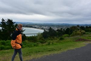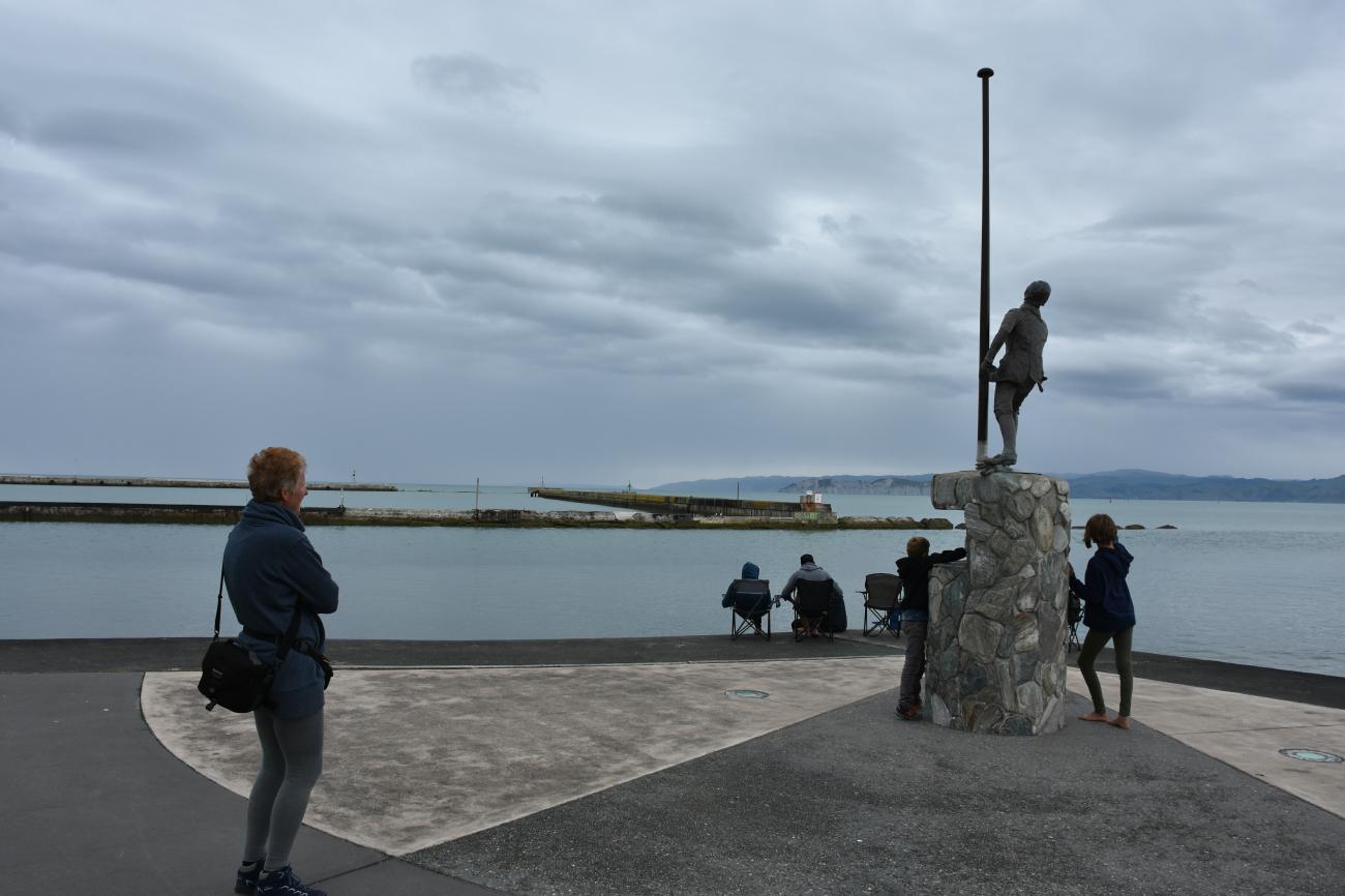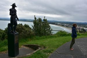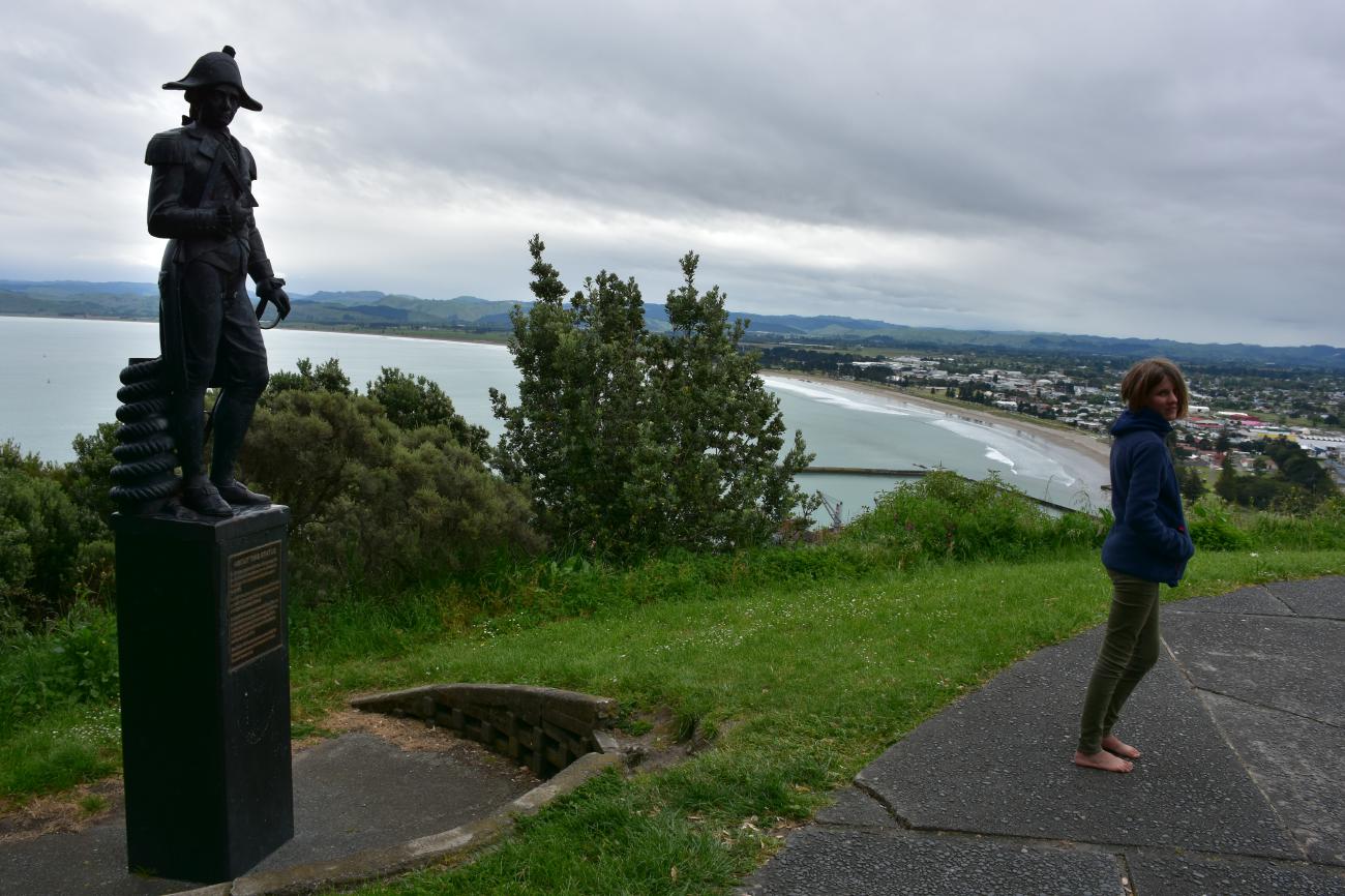 Danach ging es zum Kaiti Hill, von wo aus man einen wunderschönen Blick über Gisborne und Umgebung hatte. Es gab dort ebenfalls eine weitere Statue zur Erinnerung an Cook. Allerdings passen weder Uniform, noch Gesichtszüge zu Cook. Wie passend die Inschrift „Who is this man? We have no idea“
